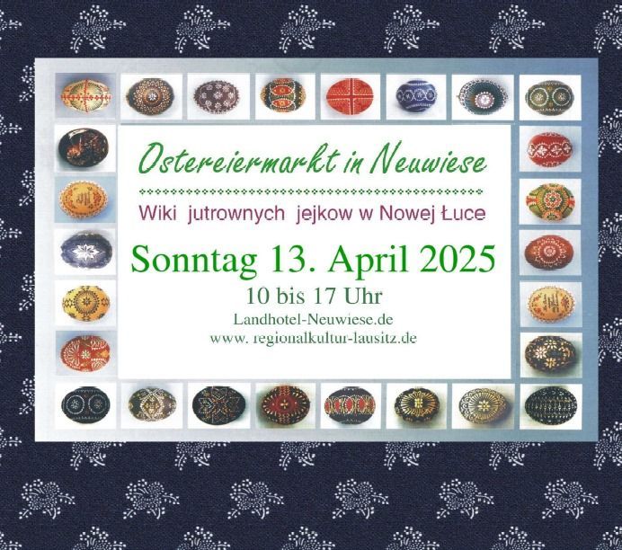 Unser Markt findet seit über 30 Jahren am Wochenende vor Ostern statt und bietet die Möglichkeit, Trachten anlaßbezogen in einer familiären Atmosphäre zu tragen. Ostereiermaler zeigen das Verzieren der typischen sorbischen Ostereier in den verschiedenen Techniken: Kratzen, Ätzen, Wachsbatik- und Wachsbossiertechnik. Unserem Nachwuchs gebem wir die Möglichkeit in ihren farbenfrohen Trachten aufzutreten. Liebhaber und Interessierte der sorbischen Ostereier und Trachten sowie des Blaudruckhandwerks, des Spinnens, Weben und Klöppelns finden hier Ansprechpartner und regen Gedankenaustausch. Wir freuen uns auf Ihren Besuch und begrüßen Sie zur Eröffnung mit einem Stück von unserem Osterbrot.