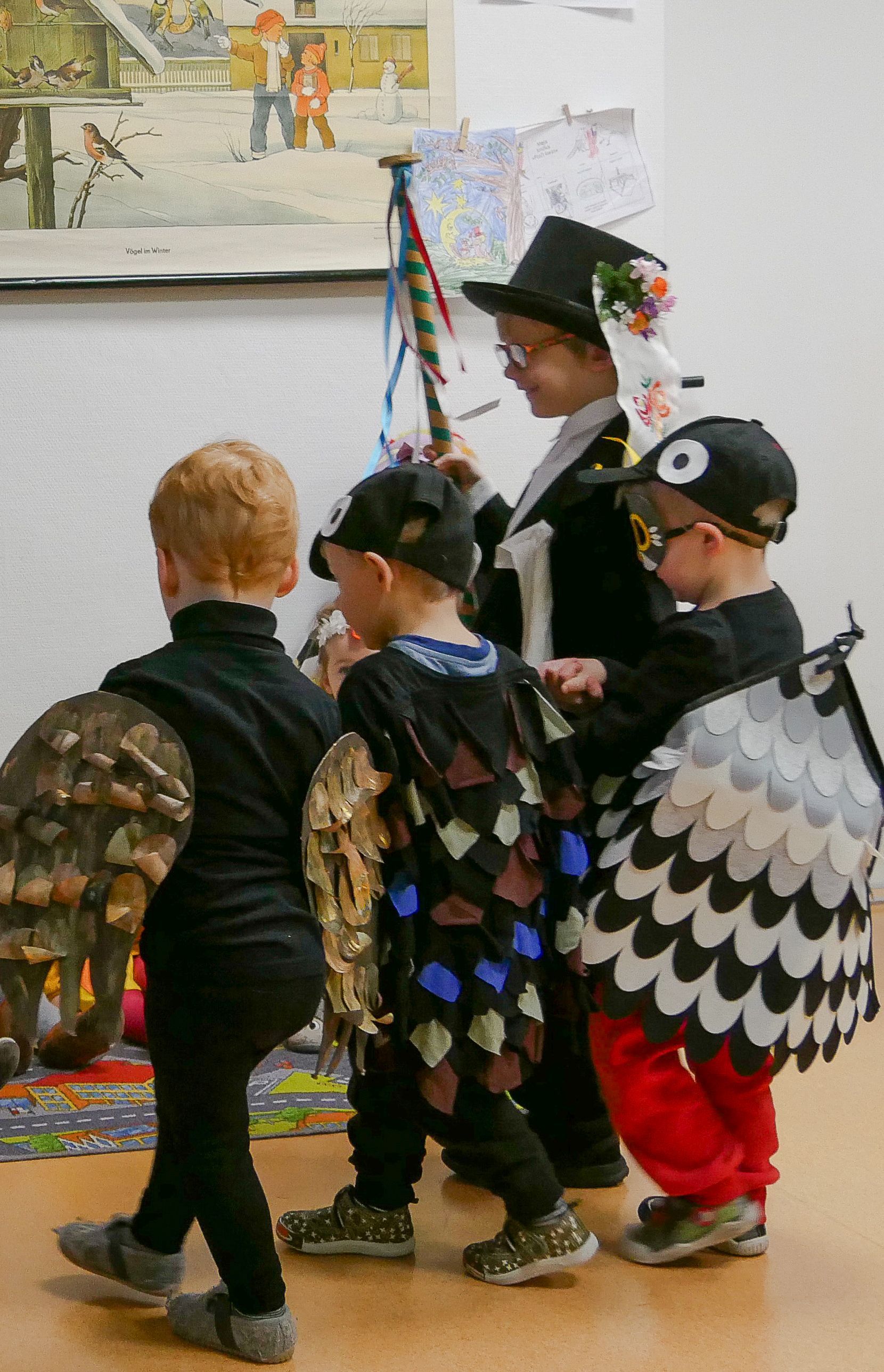 Eines der auffälligsten Anzeichen für den bevorstehenden Wechsel der Jahreszeiten sind laut vernehmbare Vogelstimmen. Ihr Gesang markiert den Beginn der Brutzeit vieler Vogelarten, ein faszinierendes Phänomen, das das Ende der kalten Jahreszeit anzeigt und Hoffnung auf die wärmeren Frühlingsmonate bringt. Der Jahresbrauch der Sorben besagt, dass die Vögel zu eben dieser Zeit Hochzeit feiern und den Menschenkindern etwas von ihrem Festmahl abgeben. Es ist es Brauch, dass die Kinder am Vorabend des 25. Januars voller Vorfreude einen Teller herausstellen, traditionell auf das Fensterbrett oder dort, wo in der Winterzeit die Vögel gefüttert wurden. Am nächsten Morgen sind dann auf dem Tellerchen Süßigkeiten zu finden. Man erzählt den Kindern, dass die Vögel diese Gaben gebracht haben, weil sie sich auch dafür bedanken, dass die Kinder sie in kalten und eisigen Wintertagen ausreichend mit Futter versorgt haben. Es ist es Brauch, dass die Kinder am Vorabend des 25. Januars voller Vorfreude einen Teller herausstellen, traditionell auf das Fensterbrett oder dort, wo in der Winterzeit die Vögel gefüttert wurden. Am nächsten Morgen sind dann auf dem Tellerchen Süßigkeiten zu finden. Man erzählt den Kindern, dass die Vögel diese Gaben gebracht haben, weil sie sich auch dafür bedanken, dass die Kinder sie in kalten und eisigen Wintertagen ausreichend mit Futter versorgt haben.Die Kinder verkleiden sich in die mit ihren Eltern und Freunden gebastelten Vogelkostümen wie Uhu, Storch oder Pfau als Hochzeitsgäste und bringen dem Hochzeitspaar Geschenke.
